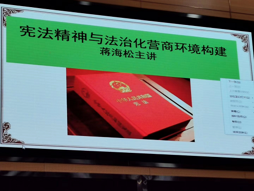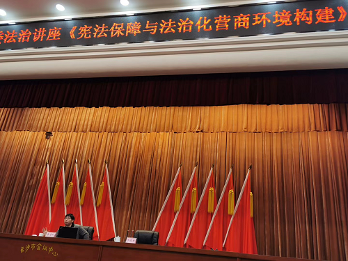 2019年12月11日,长沙市发展和改革委员会在长沙市会议中心三楼举办《宪法保障和法治化营商环境构建》专题法治讲座。会议特邀beat365中国官方网站院长助理蒋海松副教授开讲,市发展改革委党委委员、副主任卞佑明主持,委全体干部职工参加。蒋教授根据宪法周活动与最新颁布的《优化营商环境条例》相关内容,结合长沙市经济社会发展实际,进行了深入浅出,紧贴实际的精彩讲授,受到广泛好评。