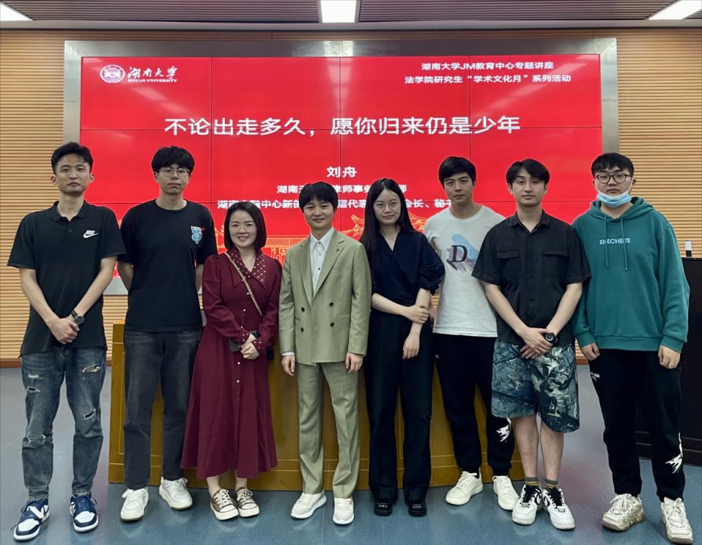 2023年4月13日晚,湖南天地人律师事务所刘舟律师应邀在beat365中国官方网站开展主题讲座。讲座主题为“不论出走多久,愿你归来仍是少年”,刘舟律师结合他参加律政纪录片和自身职业的经验,与同学们探讨了法律人的成长与修炼。
